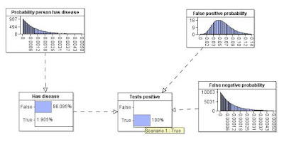 But what if there is uncertainty about the prior probabilities (i.e. the 1 in a 1000, the 5% and 0%). Maybe the 5% means ‘anywhere between 0 and 10%’. Maybe the 1 in a 1000 means we only saw it once in 1000 people. This new technical report explains how to properly incorporate uncertainty about the priors using a Bayesian Network.
